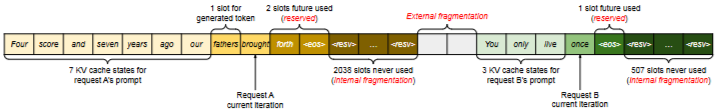 - Orca의 Buddy Allocator 특성(2의 제곱수 단위 할당) 때문에 1024 토큰 길이의 프롬프트가 오면 딱 맞춰 할당하는 게 아니라 그보다 큰 공간(예: 2048)을 잡거나, 혹은 대화가 길어질 것을 대비해 미리 크게 잡아둡니다.